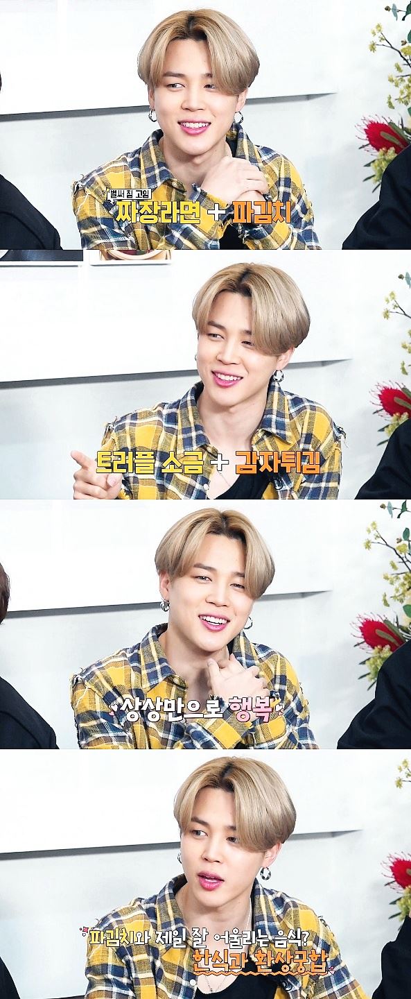 지난 16일 새로운 인트로 영상과 함께 돌아온 방탄소년단 자체 예능 '달려라 방탄' EP. 142에서는 125화에 이어 더 본 코리아 대표 백종원과의 두 번째 만남 '환상의 궁합 특집'이 방송됐다. 지민은 짜장라면과 파김치, 트러플 소금과 감자튀김 등 누구나 공감할 만한 환상의 궁합을 자랑하는 음식을 추천하고 이끌리듯 '파 팀'으로 들어가 파김치와 짜장라면 만들기에 돌입했다.