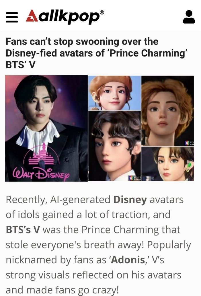 지난 16일 북미 연예 매체 '올케이팝(allkpop)'은 팬들이 '뷔를 디즈니 아바타화하는 작업을 멈출 수 없을 만큼 즐기고 있다'는 제목과 함께 그의 국보급 비주얼에 집중 조명했다. 매체는 최근 사진을 디즈니 작화로 자동변환 시켜주는 어플이 인기를 끌고 있는 가운데 특히 뷔는 모든 사람들의 숨을 멎게 하는 '프린스 챠밍'으로 화제가 되고 있다고 전했다.