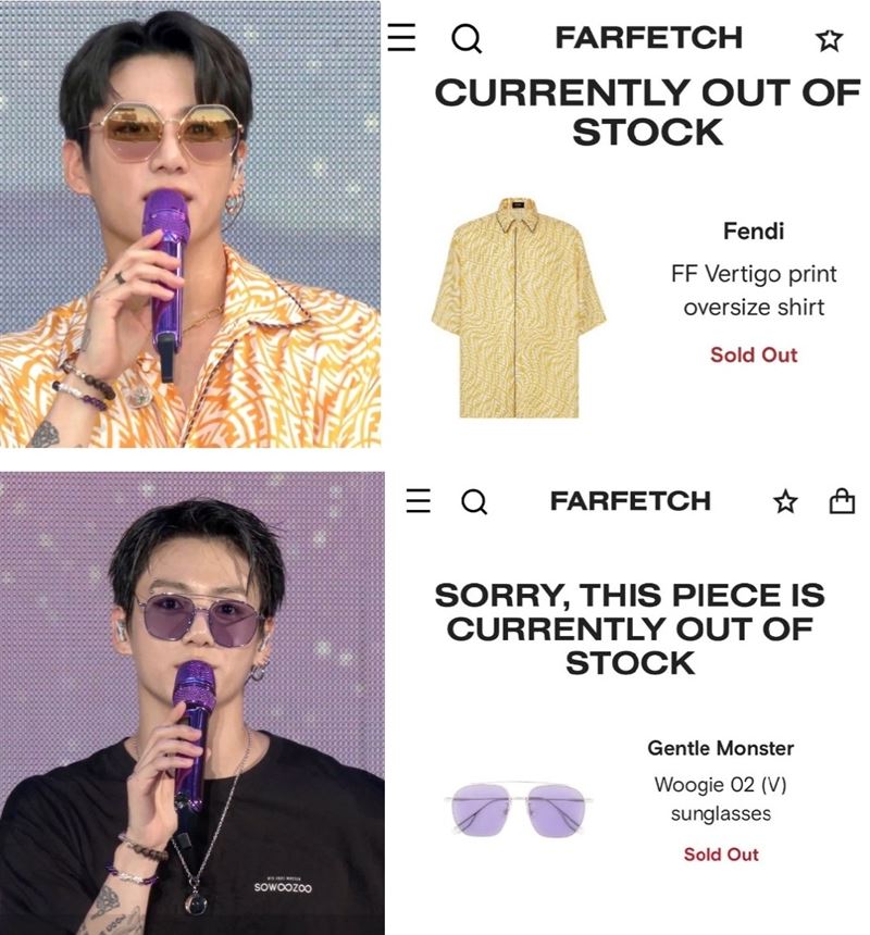 한편, 같은 날 13일 오후 6시 30분(한국시간) 온라인 팬미팅 'BTS 2021 머스터(MUSTER) 소우주' 공연에서 정국이 착용한 노란색 펜디 셔츠와 젠틀 몬스터 선글라스도 '파페치'(Farfetch) 공식 쇼핑몰에서 품절됐다.
