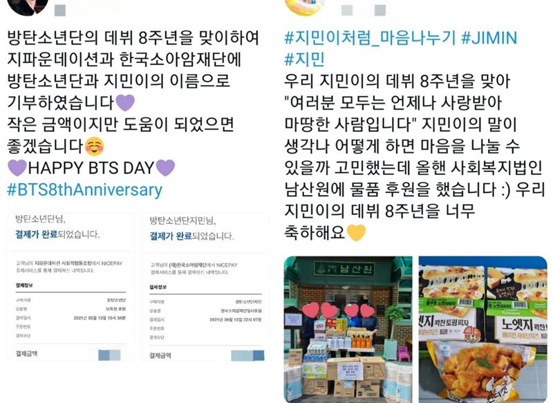 방탄소년단 지민의 8주년 데뷔 기념일을 축하하며 다양한 기부와 선행이 꾸준히 이어지고 있다.
