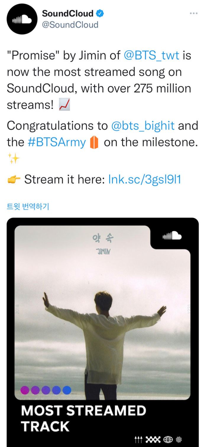 지난 11일 지민의 약속은 최단 기간 2억 7510만 스트리밍을 달성하며 사운드 클라우드의 모든 기록을 갈아치우고 전세계 모든 주요 음원 플랫폼 중 유일하게 최다 스트리밍 1위를 차지한 곡으로 자랑스럽게 한국을 빛냈다.