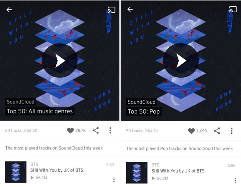 지난 21일 정국의 자작곡 'Still With You'가 글로벌 음악 공유 사이트 사운드클라우드 톱50(Top50) 차트의 전체 음악 장르(All music genres) 부문에서 1위를 차지했다. 톱50(Top50)차트의 팝(Pop) 부분에서도 1위에 오르며 여전히 뜨거운 인기를 보여줬다.