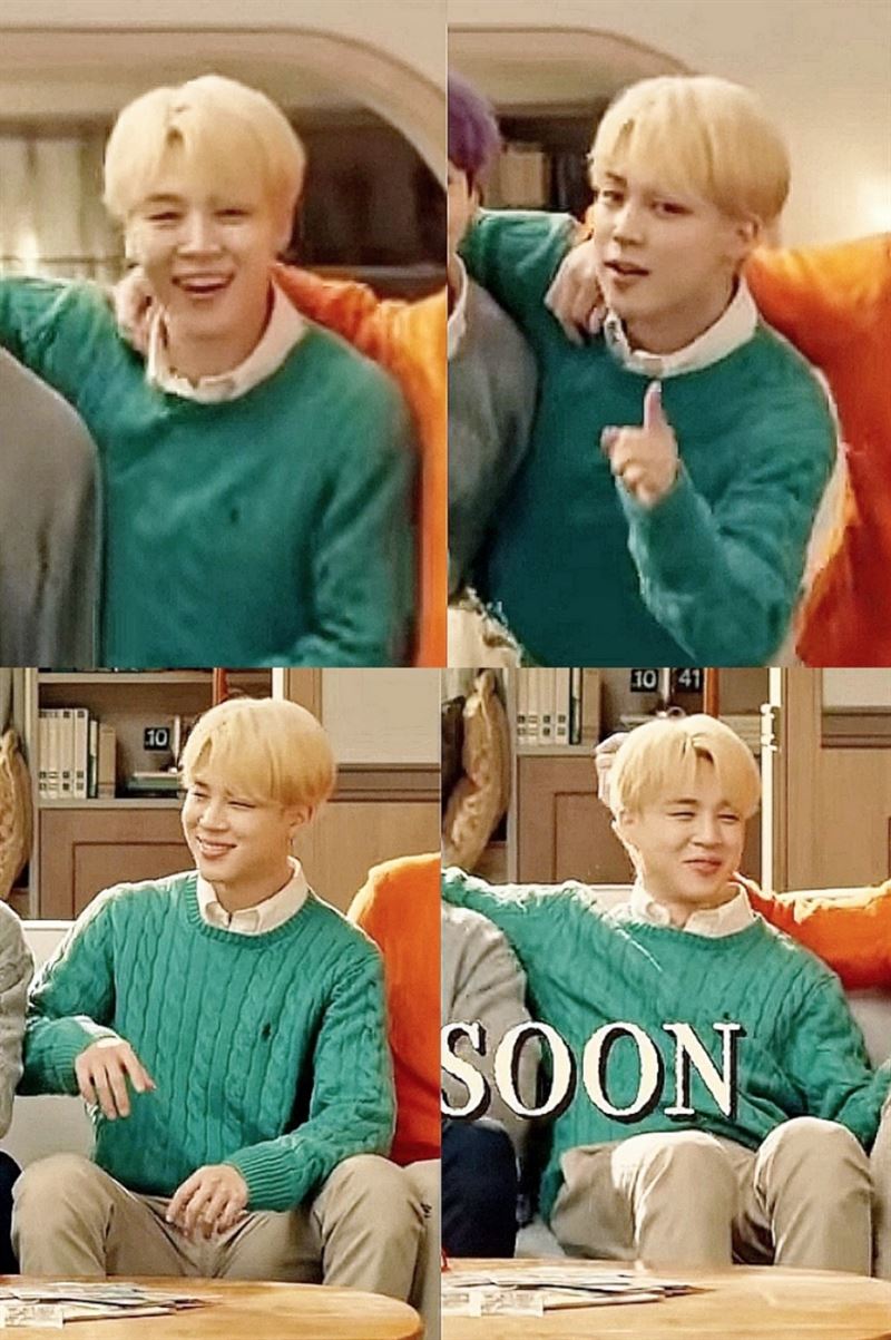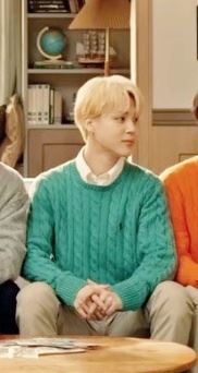 지민은 초록색 스웨터 안에 흰색 셔츠를 매치한 프레피룩 스타일링으로 희고 깨끗한 피부와 금발의 헤어가 완벽하게 조화를 이루며 귀공자 아우라를 발산했다. 지민은 함께 모여 어깨 동무 포즈를 취할 때도 균형이 잘어우러지는 포즈로 전체적인 흐름을 깨지 않으면서 분위기를 주도해 광고 천재의 센스를 선보였다.