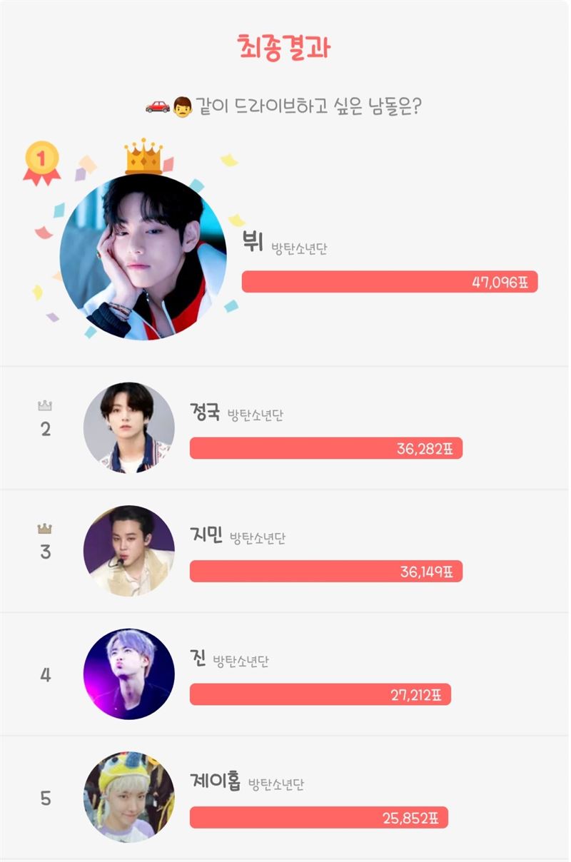 아이돌 인기 순위 서비스 '최애돌'은 지난 17일부터 23일까지 '같이 드라이브하고 싶은 남돌은?' 투표를 실시했다. 그 결과 뷔는 총 8만 6347표 중 4만 7096표를 얻으며 1위를 차지했다.