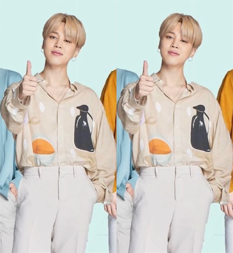 지민은 포근한 분위기의 세트장을 배경으로 아이보리 슬랙스와 독특한 무늬가 포인트인 베이지색 셔츠를 입고 등장했다. 황금빛 눈부신 금발의 지민은 놀라운 다리 길이와 우월한 비율로 아이보리 슬랙스를 완벽히 소화해 내며 여행의 설렘과 동시에 여유로움이 느껴지는 패션으로 팬들을 또 한번 매료시켰다.