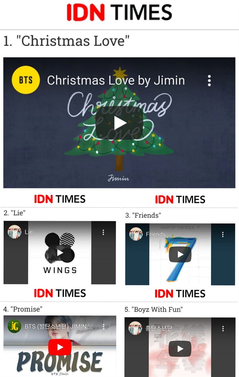 먼저 매체는 지민이 지난해 12월 24일, 팬들에게 선물한 'Christmas Love’를 소개했다. 이어 "깊은 가사는 노래를 듣는 모든 사람들의 마음을 감동시킨다"고 덧붙였다. 해당 곡은 당시 예고 없는 깜짝 공개에도 폭발적으로 화제를 모으며 현재까지 시즌송에 국한되지 않는 꾸준한 인기를 누리고 있다.