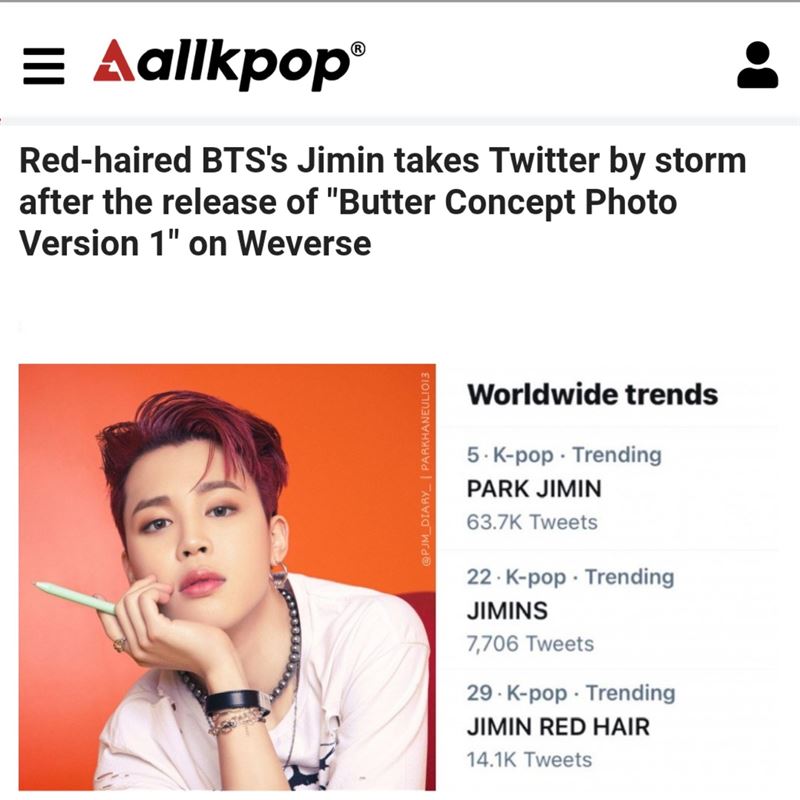 지난 28일 자정 방탄소년단은 7월 9일 발매를 앞두고 ‘Butter’ 싱글 앨범의 컨셉 포토를 공개했다. 사진 속 지민은 강렬한 태양을 연상시키는 숏 컷의 레드 헤어로 등장, 범접할 수 없는 아우라로 좌중을 압도했다.