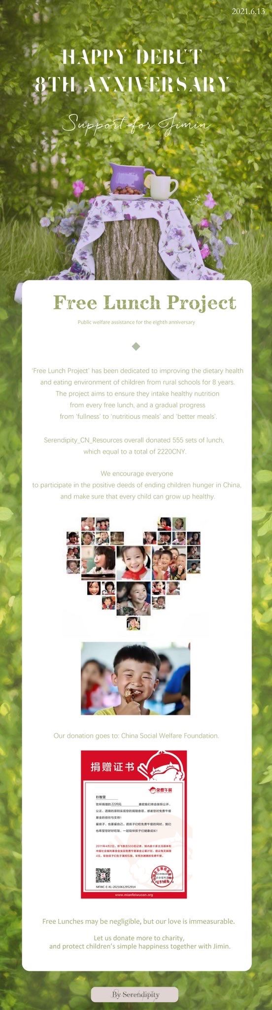 최근 지민의 중국 팬덤인 ‘serendipity_CN’은 SNS를 통해 "지민의 데뷔 8주년을 맞아 중국 사회 복지 재단에 555세트의 점심을 기부했다"고 알렸다. 이어 "중국에서 진행되고 있는 '무료 급식 프로젝트'는 아이들의 식생활 건강과 식사 환경을 개선하기 위해 진행되고 있다"고 전했다.