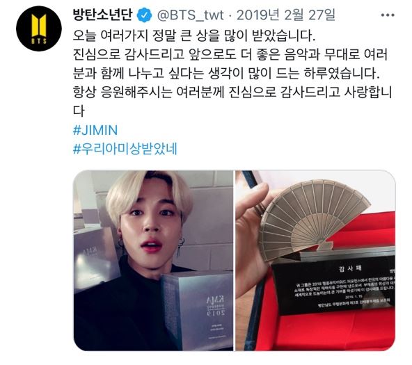 지민은 이 무대를 통해 평안남도 무형문화재 제3호 김백봉 부채춤 보존회로부터 한국의 전통 춤을 알린 공로를 감사패 수여로 공식 인정받기도 했다. 지민은 감사패 사진과 함께 감사함을 담은 글을 SNS에 인증하는 훈훈함을 보였다.