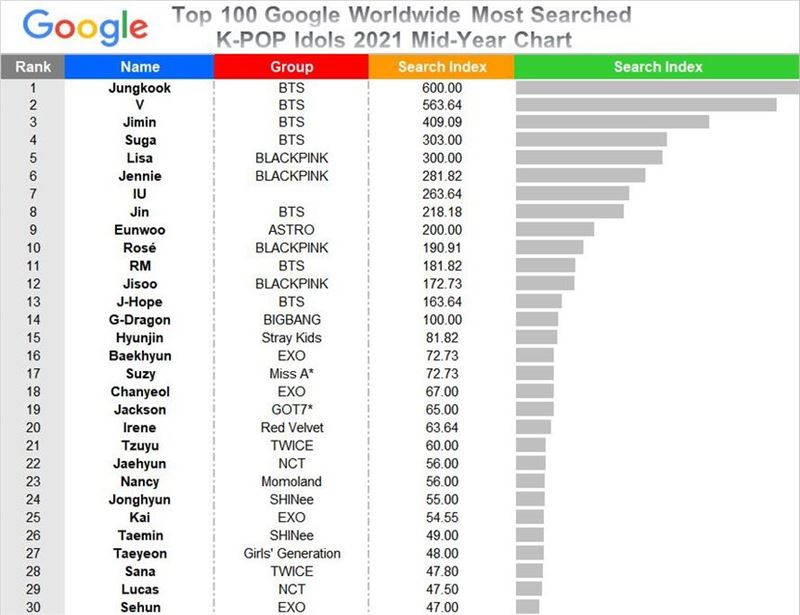 지난달 29일 '월드 뮤직 어워드'(WMA)는 공식 SNS를 통해 '2021년 상반기 구글 전세계 최다 검색 K팝 아이돌 TOP100' 이라는 제목으로 순위가 집계된 리스트를 게재했고 방탄소년단 정국이 구글 최다 검색 K팝 아이돌이라고 발표했다. 해당 리스트는 남녀 K팝 아이돌 상위 1위~100위까지 순위를 나열했으며 이 중 정국은 검색 인덱스 600으로 1위를 차지했다.