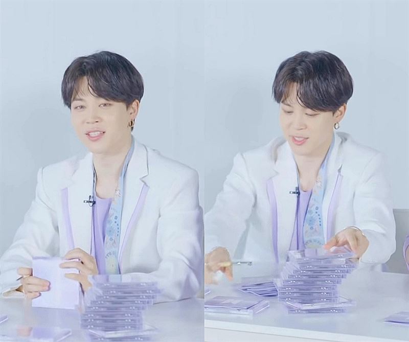 지난 4일 방탄소년단은 공식 유튜브 채널을 통해 ‘Autograph Time for BTS’ 제목의 영상을 업로드했다. 영상에서 멤버들과 함께 앨범에 사인을 하고 있는 지민은 라벤더 색상의 셔츠에 올 화이트 수트를 매치, 우아하면서 순수하고 사랑스러운 비주얼을 선보였다.