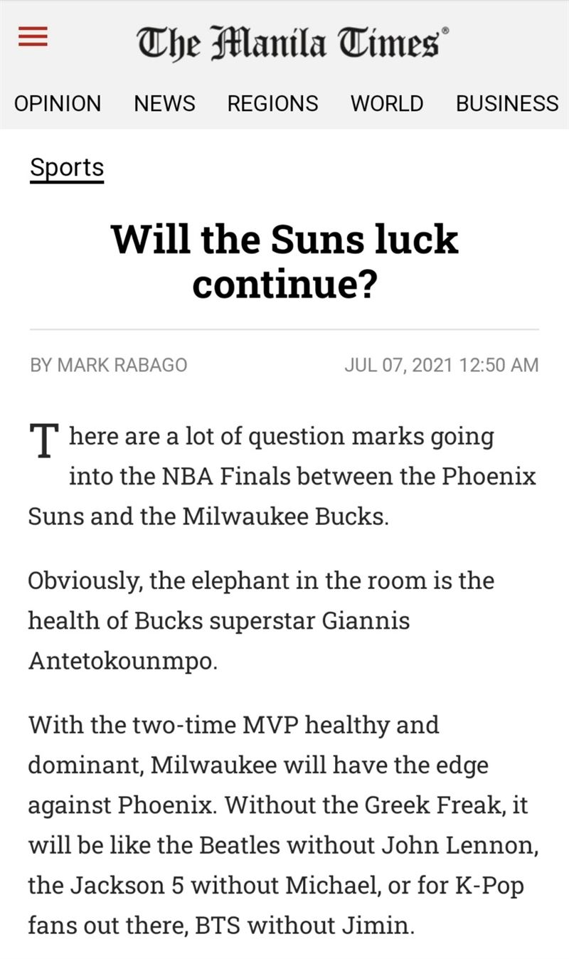 지난 7일(한국시간) 외신 마닐라 타임즈(Manila Times)는 NBA 챔피언결정전을 앞둔 NBA 슈퍼스타 야니스 아데토쿤보(Giannis Antetokounmpo)에 대한 기사를 게재하며 지민을 언급해 눈길을 끌었다.