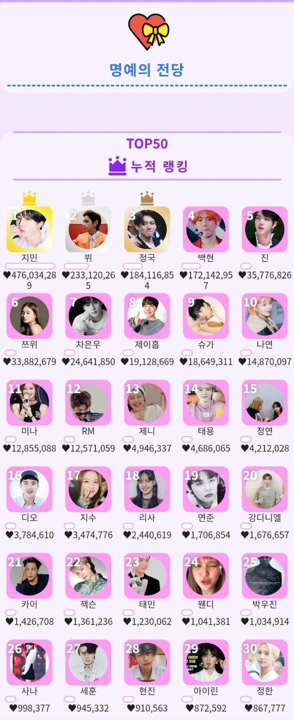 해당 어플은 K팝 아이돌을 대상으로 실시간 투표를 집계해 매일 자정에 리셋하며, 일간·주간·월간 순위와 전체 득표 합산으로 '명예의 전당'의 주인을 정한다. 지민은 7월 첫째 주 랭킹에서 총 4646만 304개의 하트를 받으며 1위를 기록했다.