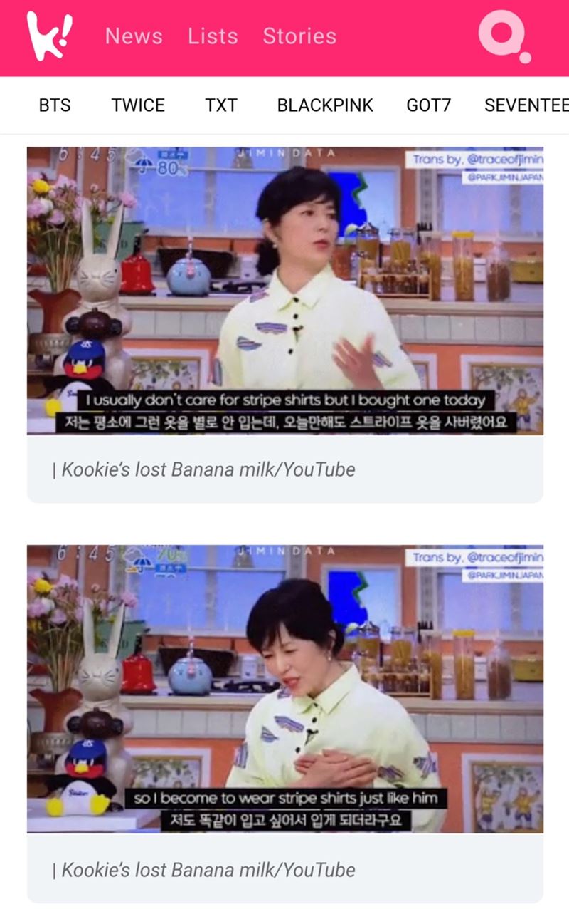 그녀는 "지민은 무대의상이 아닌 평소 복장일 때는 가로로 된 스트라이프 옷이 많더라"며 "나는 평소에 스트라이프 무늬 옷을 잘 안 입는데 샀다"고 밝혔다. "지민이 스트라이프 옷을 입으니까 똑같이 입고 싶어서 구입했다"며 스타와 가까워지고 싶어하는 애정어린 마음을 표현한 것.