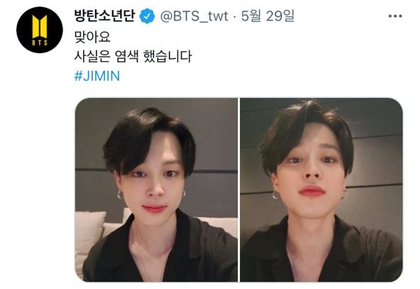 이어 "팬들이 (인터뷰 영상 흑발에) 난리가 나니까 '나 검은색으로 염색했어요'라고 알려준 것은 지민이가 팬들의 마음을 받아주고, 대답해주고, 뭔가 우리를, 팬들을 항상 제대로 보고 있는 것 같다"며 지민의 세심하고 지극한 팬 사랑을 재차 강조했다.