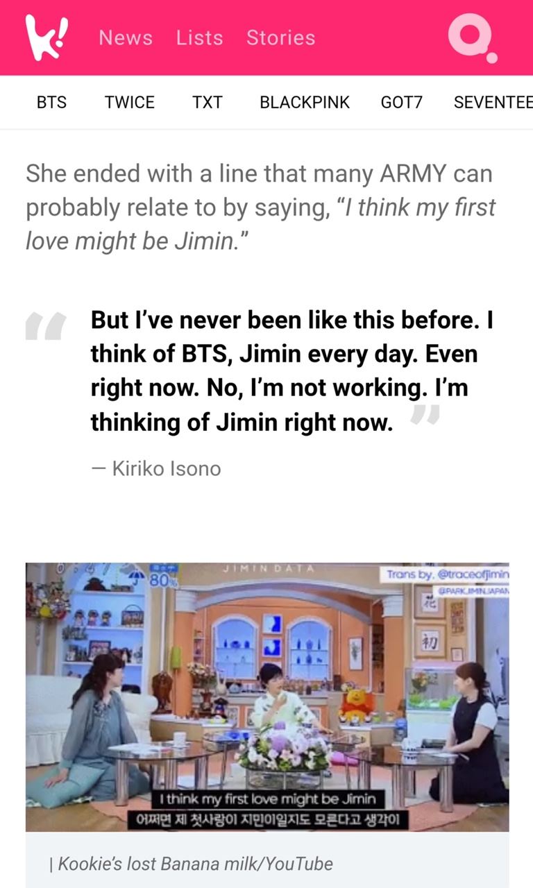 일본 유명 방송인 ‘키리코 이소노’(Kiriko Isono)는 지난달 27일 후지TV 버라이어티 쇼에 출연해 “방탄소년단 멤버 중 지민을 특히 더 좋아한다”고 지민에 대한 각별한 팬심을 고백했다.