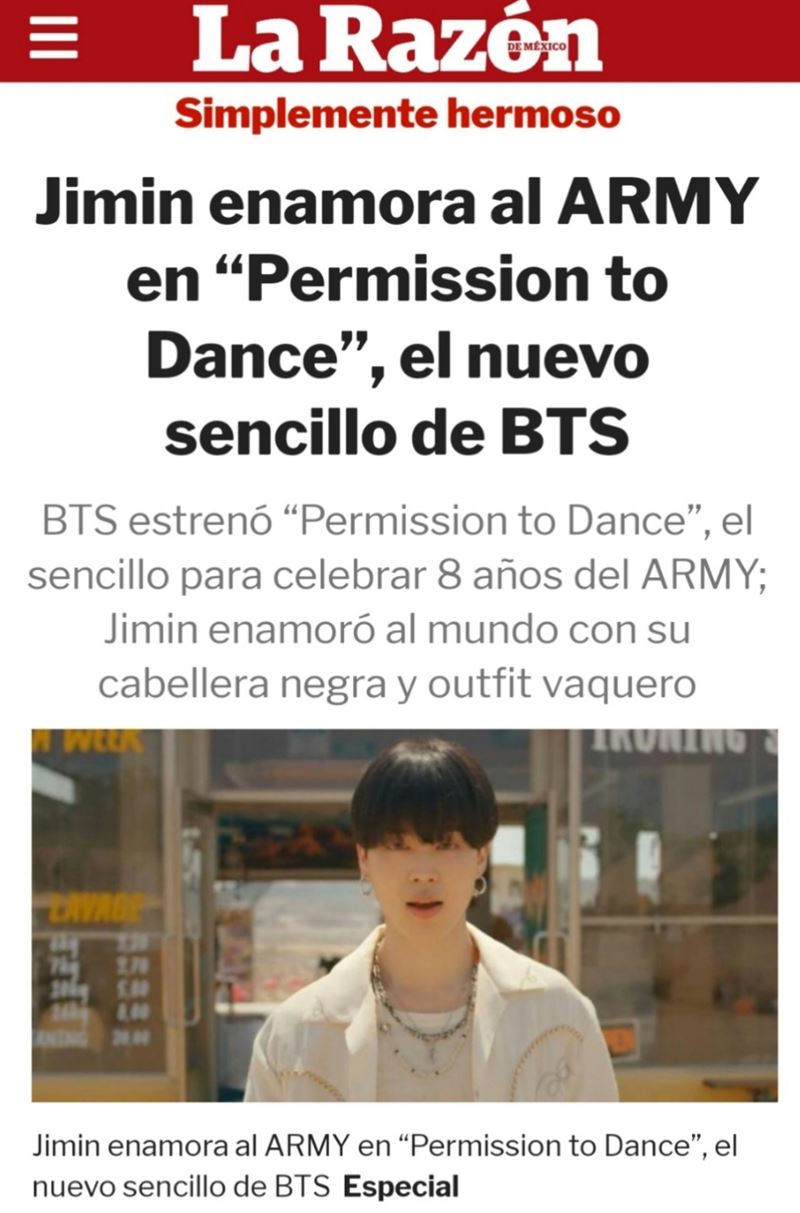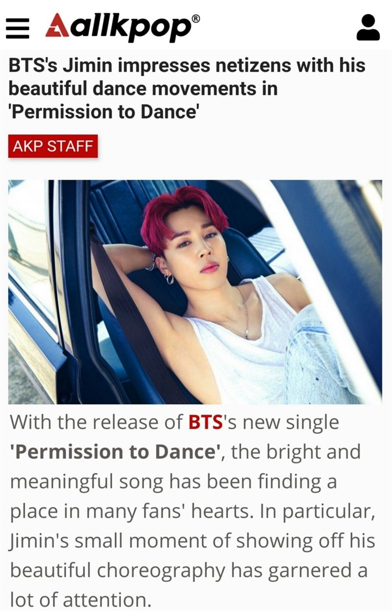 미국 매체 올케이팝(Allkpop)은 9일 네이버 나우(NOW)를 통해 'Permission To Dance' 첫 무대가 공개되자 "지민이 아름다운 춤 동작으로 네티즌들을 감동시켰다"며 적극적인 자체 보도에 나서기도 했다. 매체는 "카메라가 어떤 각도로 촬영하든 그의 아름다운 춤 동작을 숨길 수 없는 것에 팬들이 놀라움을 나타냈다"며 "지민은 놀랍도록 작은 디테일까지 놓치지 않아", "무대 천재 지민", "Just perfection, So beautiful" 등 생생한 팬 반응도 덧붙였다.