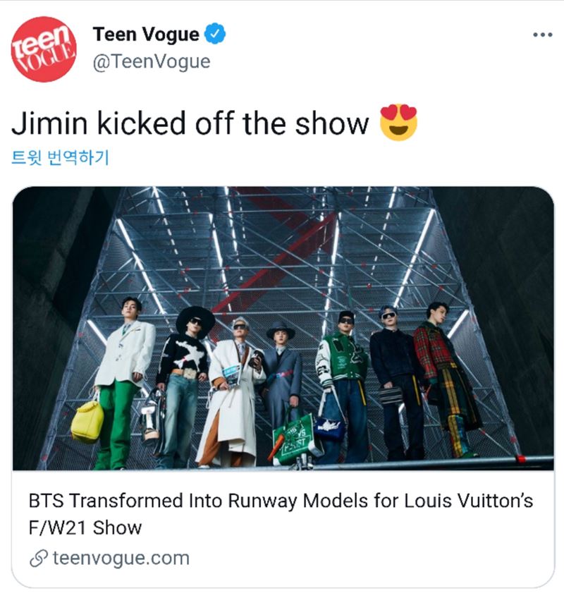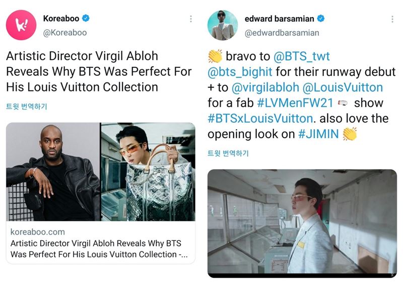 미국 매체 코리아부(Koreaboo) 또한 '버질 아블로'가 밝힌 '방탄소년단이 루이비통 컬렉션에 완벽한 선택인 이유'에 대해 보도하며 버질 아블로와 지민의 단독 사진을 게시해 '루이비통 프론트맨'인 지민의 존재감을 재확인시켰다.
