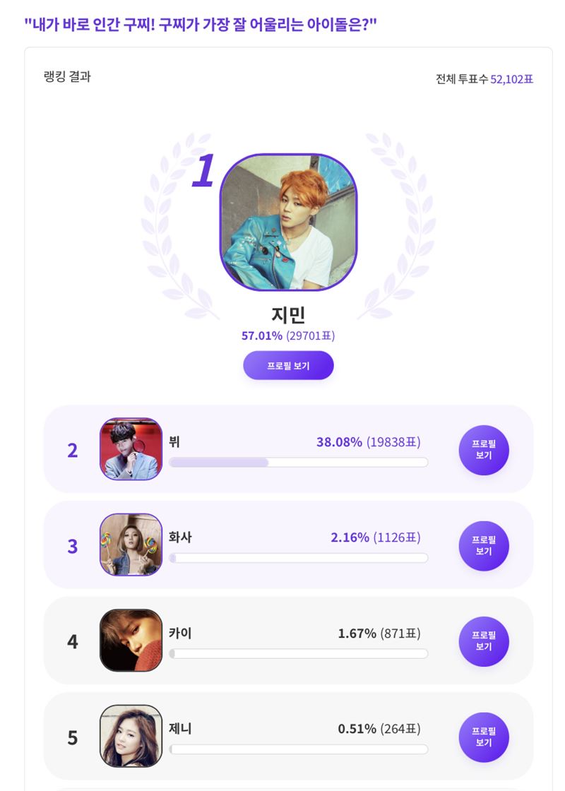 지난 7월 11일부터 17일까지 총 7일간 '익사이팅디시'는 '내가 바로 인간 구찌! 구찌가 가장 잘 어울리는 아이돌은?’ 투표를 진행했다. 전체 5만 2102명이 참여한 이번 투표에서 지민은 2만 9701 표를 받아 57.01%의 과반수가 넘는 압도적 지지율로 1위를 차지했다. 선택 키워드로는 ‘고혹적’이 69%로 가장 높았으며, ‘매혹적’ 14%, ‘러블리’ 10%가 뒤를 이었다.