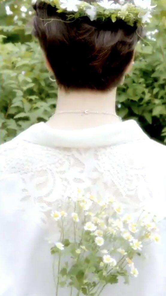 지민은 순백의 단정한 뒷모습에 화관을 쓰고 들꽃 꽃다발을 등뒤로 보인 채 서 있다. 길게 뻗은 하얗고 깨끗한 목선은 우아하면서도 묘한 분위기를 자아내며 알 수 없는 설렘을 선사했다.