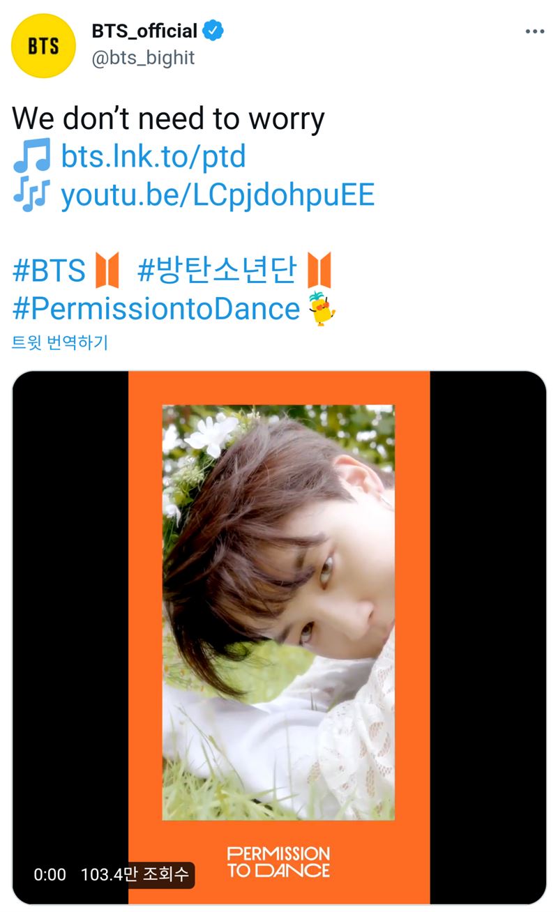 18일 0시 방탄소년단은 공식 SNS를 통해 8초 가량의 짧은 영상을 공개했다. “We don’t need to worry”라는 신곡 'Permission to Dance' 속 지민이 부르는 가사와 함께 공개된 영상은 팬들에게 보는 순간 힐링을 선사했다.