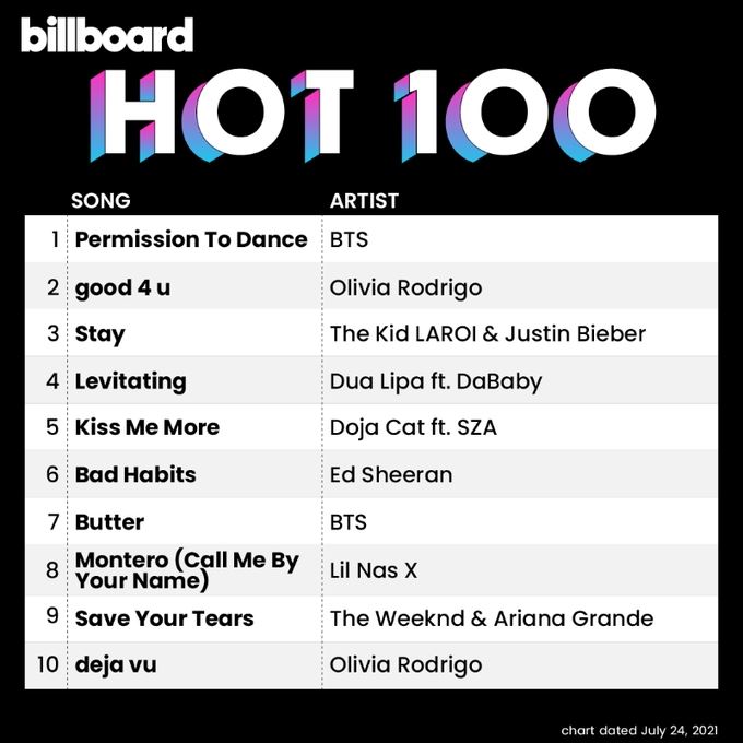 미국 빌보드는 19일(현지시간) 방탄소년단이 지난 9일 발매한 'Permission to Dance'가 '핫 100' 차트(7월 24일 자) 1위에 올랐다고 발표했다. 진입 첫 주 1위로 직행한 'Permission to Dance'는 앞서 6월 5일 자부터 7월 17일 자 차트까지 7주 연속 '핫 100' 정상을 지키던 디지털 싱글 'Butter'의 바통을 이어받았다. 'Butter'는 '핫 100' 7위에 자리해 방탄소년단은 '핫 100' 차트 톱(TOP)10에 2곡으로 이름을 올려놓았다.