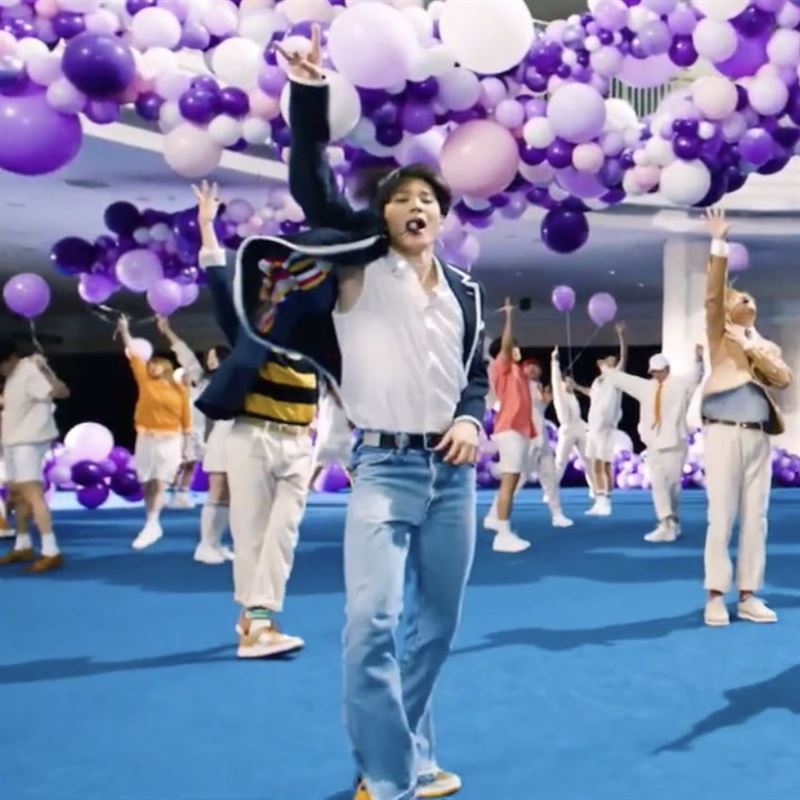 보라색과 흰색 풍선으로 장식된 무대에서 지민은 리듬을 자유자재로 타며 끊임없이 이어지는 현란한 발동작 안무에도 여유로운 표정 연기까지 더해 '메인댄서'다운 무대력으로 다채로운 무대를 완성했다.