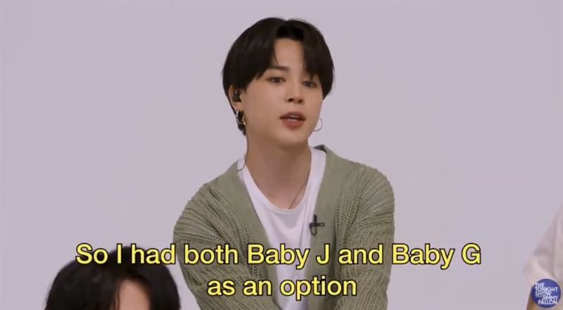 ‘예명이 베이비 제이(BABY J)가 될 뻔했다는데 사실인가요?' 질문에 지민은 “베이비 제이(Baby J)도 있었고 베이비 지(Baby G)도 있었지만 아무리 생각해도 인사할 때 '하이, 아임 베이비 제이' 이러는 게 이상했다. 지민이 제일 좋은 것 같아 바꾸게 됐다”고 답했다.