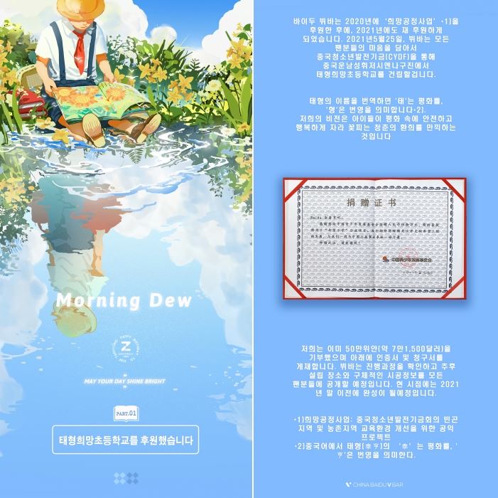 지난 17일 뷔의 중국 최대 팬클럽 '바이두뷔바'는 '태형 희망 초등학교' 2호를 건립한다고 공식 발표했다. 'Morning Dew'(아침 이슬)이라는 타이틀의 이번 프로젝트는 팬들이 뷔의 생일을 축하하기 위해 모은 생일모금 중 일부를 공익사업에 기부하며 이루어진다.
