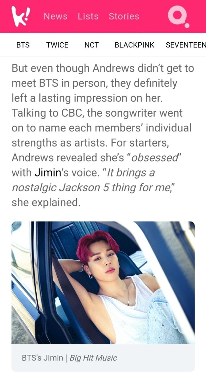 'Butter' 제작에 참여한 송라이터 제나 앤드류스(Jenna Andrews)는 최근 캐나다 CBC 뮤직(CBC MUSIC)과의 인터뷰에서 "지민의 목소리에 푹 빠졌다"며 "나에게 '잭슨 5'의 향수를 불러일으킨다"고 말했다.