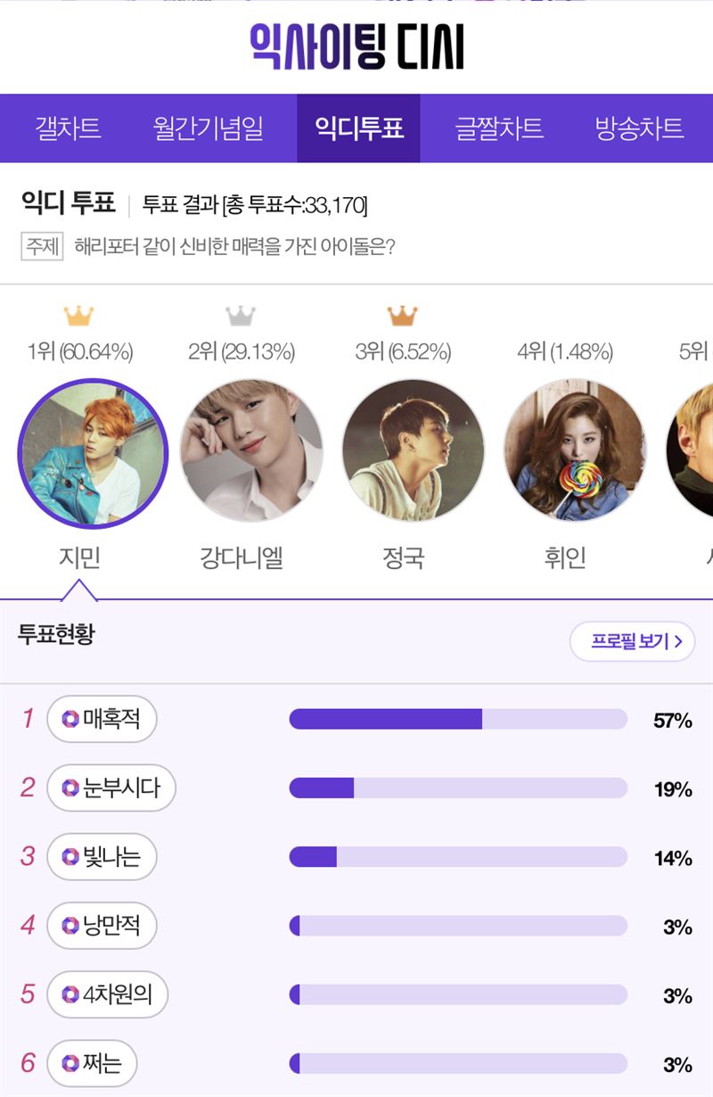 선정된 지민의 매력으로는 '매혹적' 57%, '눈부시다' 19%, '빛나는' 14%가 차례를 이었다.