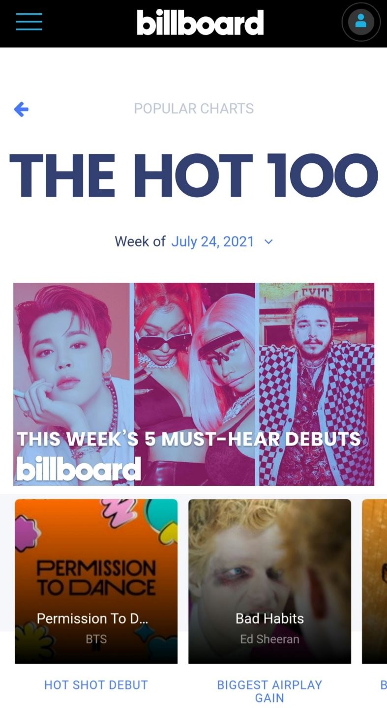 방탄소년단은 지난 20일(현지 시간) 미국 빌보드 메인 싱글 차트 '핫 100' 차트에서 7주 연속 1위인 'Butter'의 뒤를 이어 'Permission To Dance'로 또 다시 정상을 차지해 8주 연속 1위의 쾌거를 이뤘다. 빌보드는 공식 홈페이지를 통해 가장 먼저 지민의 단독 사진을 게시하고, BIA & 니키 미나즈(Nicki Minaj), 포스트 말론(Post Malone)을 차례로 썸네일로 지정해 차트 순위를 공개했다.