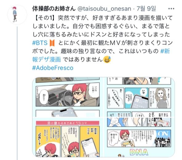 뿐만 아니라 1달 후 팬클럽까지 가입해 아미(ARMY)가 된 과정을 자세히 그려내 팬들의 공감을 이끌기도 했다. 작가는 무대 위에서와 아래에서의 갭 차이에 반해 "다른 멤버들 모두 멋있지만 지민이 없었으면 이렇게 푹 빠지지 않았을 것"이라며 지민이 최애임을 고백했다.