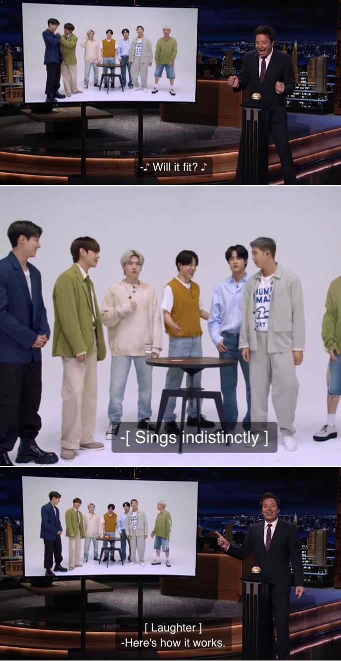 지난달 24일(한국시간) 방탄소년단은 미국 인기 토크쇼 '더 투나잇 쇼 스타링 지미 팰런'(The Tonight Show Starring Jimmy Fallon, 이하 '지미 팰런쇼')에 출연해 새로운 게임 'Will It Fit?'(거기에 들어갈 수 있을까?)로 팬들에게 즐거움을 선사했다.