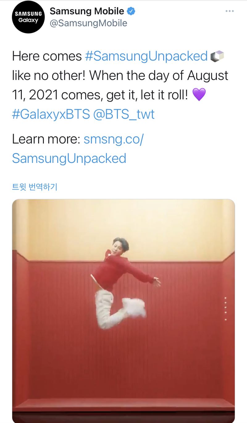 지난달 30일 삼성전자는 신형 폴더블폰 ‘갤럭시Z 폴드3’, ‘갤럭시Z 플립3’의 공개 언팩 행사를 앞두고 글로벌 파트너십을 맺고 있는 방탄소년단의 예고 영상을 공개했다. 영상은 ‘Butter’를 배경음악으로 공식 뮤직비디오의 댄스 브레이크와 ‘티저 포토 버전 1’의 엘리베이터에서 촬영됐다.