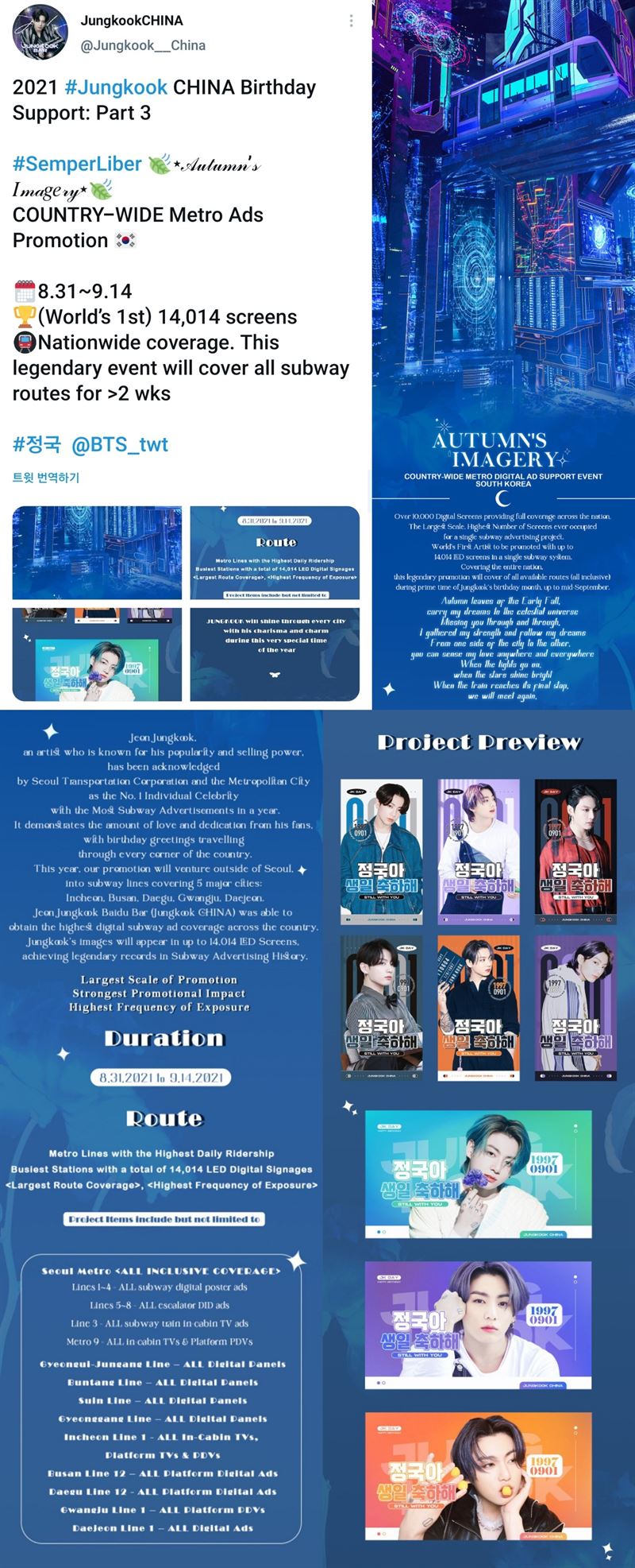 정국 차이나에 따르면 해당 광고는 서울 지하철의 1~4호선 디지털 포스터 광고 전체와 5~8호선 에스컬레이터 DID 광고 전체, 3호선 지하철 객실 TV 전체, 9호선 전 객실 TV 및 플랫폼 PDV 스크린 전체에 정국의 생일 광고를 펼칠 예정이다.