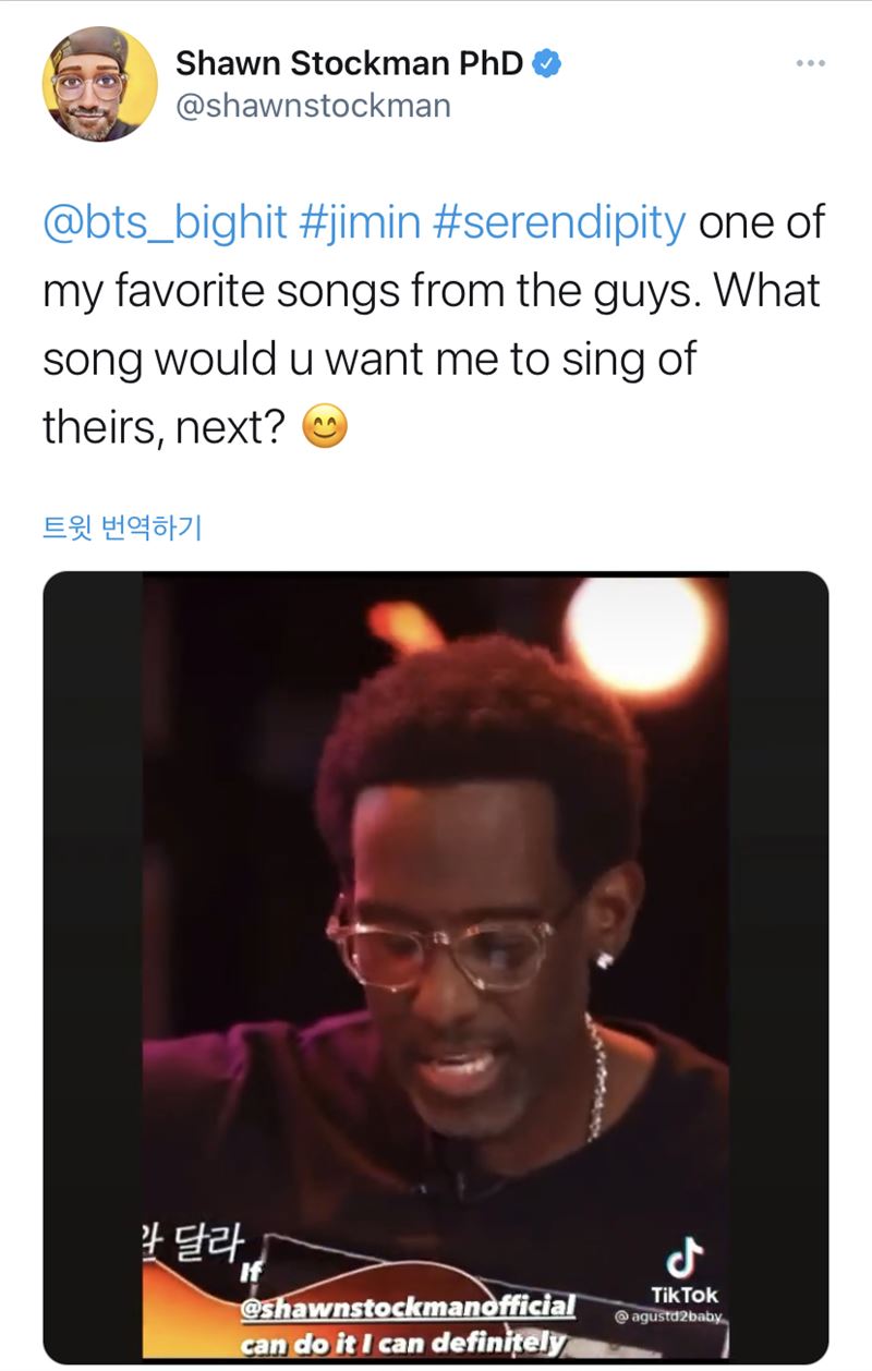 지난달 26일 숀 스톡맨은 트위터를 통해 지민의 고유 해시태그인 'jimin'과 함께 "serendipity 내가 좋아하는 노래 중 하나. 다음에는 그들의 노래 중 어떤 노래를 듣고 싶으신가요?"라며 짧은 동영상을 공개했다.