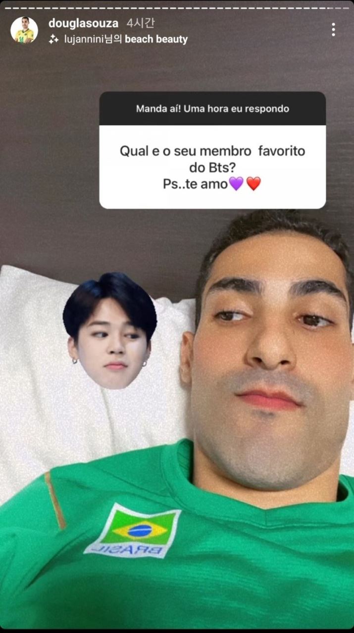 2016 리우데자네이루 올림픽 챔피언과 2019년 월드컵 금메달리스트 등 화려한 이력을 가진 브라질 남자 배구 대표팀 도글라스 소자(Douglas Correia de Souza)는 자신의 인스타그램 스토리에 지민의 얼굴 스티커 사진으로 최애 선언에 나섰다.
