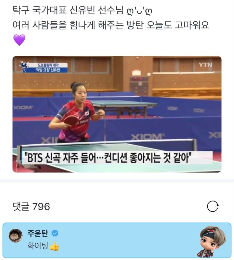 지난달 25일 팬 커뮤니티 위버스에는 팬이 신유빈 선수가 '경기 전에 방탄소년단 신곡을 자주 듣는다'는 뉴스 화면 캡처를 올렸다. 이를 본 뷔는 "화이팅"과 함께 ‘최고’의 의미가 담긴 엄지척 이모티콘 댓글로 응원했다.