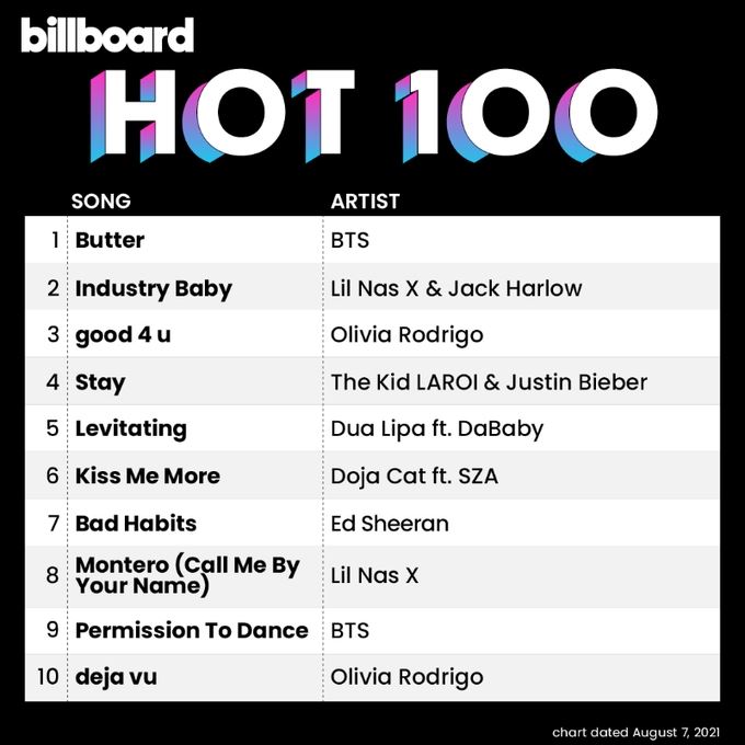 방탄소년단은 'Butter'로 지난 6월 5일 자 차트에서 진입과 동시에 '핫 100' 1위로 직행, 7주 연속 정상을 지키다 7월 24일 자 차트에서 자신들의 신곡 'Permission to Dance'와 1위 '바통 터치'하는 진기록을 세운 바 있다. 지난주(7월 31일 자) 차트에서 다시 'Butter'로 '핫 100' 정상을 탈환한 데 이어 최신 차트까지 연속으로 1위를 꿰찼다.