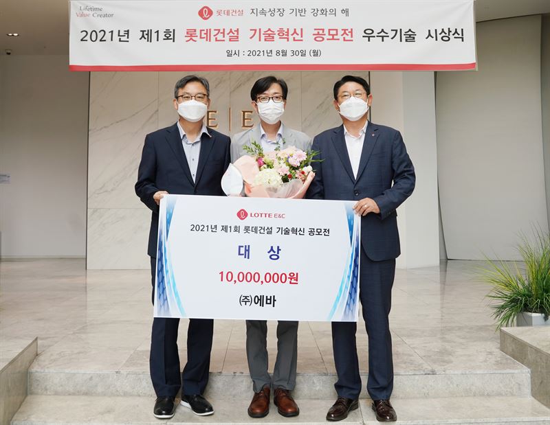 대상을 수상한 ㈜에바 이훈 대표는 “스타트업 기업은 대기업에 기술을 소개하는 진입장벽이 매우 높아 기회가 없는데 이번 공모전을 통해 당사 기술을 알리고 적용할 수 있게 되어 매우 감사하다”며 “롯데건설의 적극적인 기술혁신의 발걸음에 맞춰 당사도 최선을 다하겠다”고 수상소감을 밝혔다.