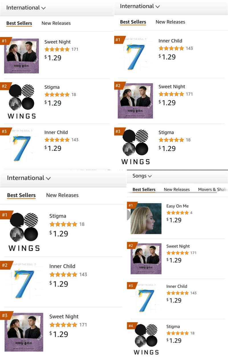 지난 16일 세계 최대 전자상거래 플랫폼 아마존(Amazon)의 인터내셔널 ‘베스트셀러 송’ 차트에 뷔의 솔로곡 ‘Sweet Night’이 1위, ‘Inner Child’가 2위, ‘Stigma’가 각각 3위에 오르며 최강 솔로파워를 과시했다. 차트 점령은 무려 19일까지 이어졌다.