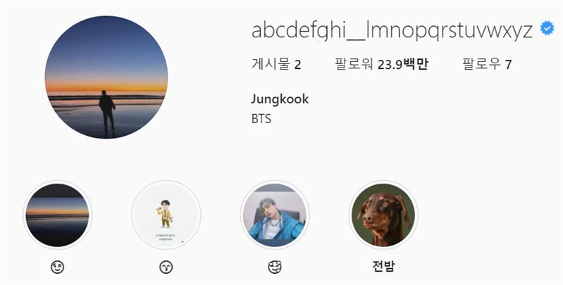 방탄소년단 멤버들은 지난 6일 데뷔 8년 만에 개인 인스타그램 계정을 개설했다. 정국은 아이디를 'abcdefghi__lmnopqrstuvwxyz'로 만들어 독특하고 재치 넘치는 면모를 보여줬다. 알파벳 a부터 z까지 나열하는 대신 자신의 이니셜 jk를 빼고 언더바를 사용했다.