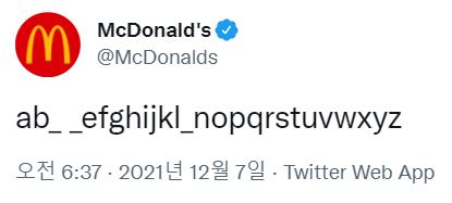 맥도날드는 지난 7일 알파벳 m, c, d(McD)를 빼고 언더바를 사용해 'ab_ _efghijkl_nopqrstuvwxyz'로 트위터 이름을 바꿨다. 이에 '어몽어스'(Among Us) 공식 계정이 "love to get happy meals at cdm"(cdm(맥도날드)에서 행복한 식사하는걸 좋아해요)라고 게시물에 댓글을 남겼다. 맥도날드는 다시 "next window pls A_ong Us"(옆 창구로 가주세요 어몽어스)라고 언더바를 사용한 댓글을 다는 센스도 보였다.