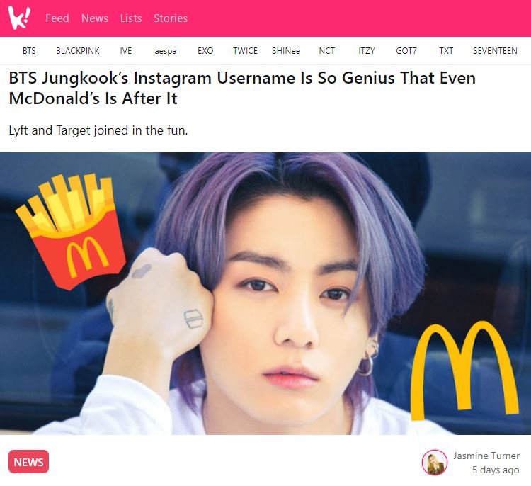 미국 매체 '코리아부'(koreaboo)는 '방탄소년단 정국 인스타그램 아이디 맥도날드도 탐낼 만큼 천재적'이라는 타이틀로 기사를 보도했다. 매체는 “맥도날드가 공식 트위터 이름을 이니셜인 'C'와 'D' 그리고 'M'을 빼서 정국의 인스타그램 아이디처럼 직접 만들었다”고 전하며 'Lyft'와 'Target'과 같은 다른 브랜드들도 그들만의 버전으로 이같은 재미에 동참했다고 말했다.