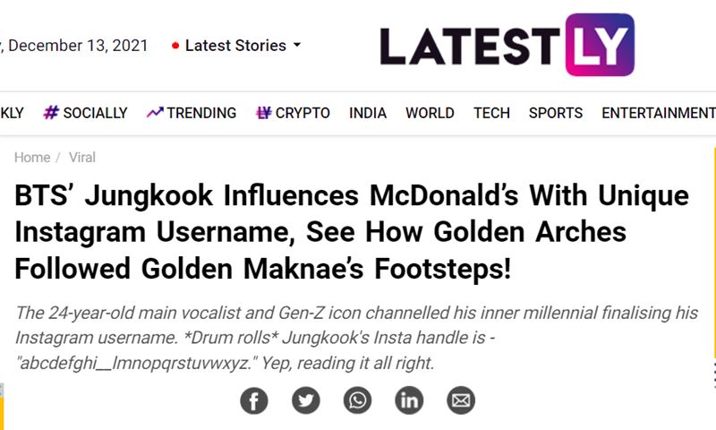 또 인도 매체 '레이티스틀리'(LatestLY)는 '방탄소년단 정국, 독특한 인스타그램 아이디로 맥도날드에 영향 미쳐'란 제목으로 "황금 막내, 트렌드 세터, 젠 Z세대 아이콘인 정국의 인스타그램 아이디에 맥도날드도 감탄하며 트위터 사용자 이름을 'ab_ _efghijkl_nopqrstuvwxyz'로 바꾸었고 다른 패스트푸드 업체들도 브랜드 이름 이니셜에 언더바를 그었다"고 보도했다.