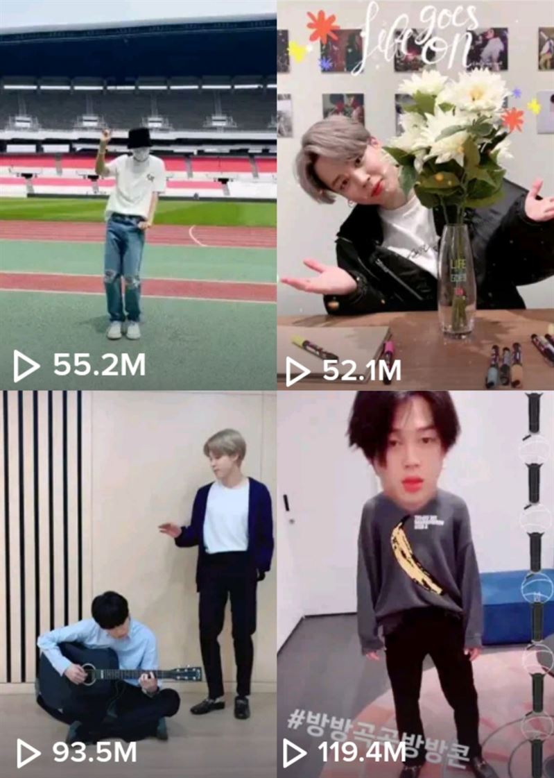 뿐만 아니라 한국 최초의 틱톡 개인 신기록을 수립, 현재까지 왕좌를 놓치지 않고 있는 지민의 2020년 방방콘(방에서 즐기는 방탄소년단 콘서트) 단독 프로모션 영상은 12일 기준 1억 1940만 뷰와 1210만 '하트'로 오랜 시간이 지나도록 많은 이용자에게 사랑받는 콘텐츠이다. 또 '멈출 수 없는 지민의 다이너마이트 댄스' 영상은 9350만 뷰와 1370만 '하트', '라이프 고즈 온' 챌린지 'Flowers for ARMY'는 5210만 뷰와 990만 '하트'를 기록 중이다.