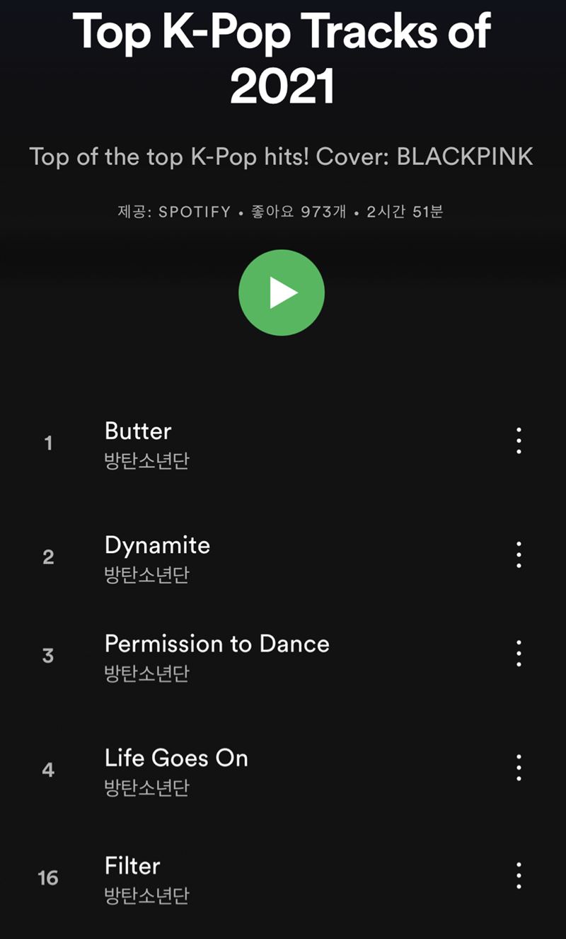 방탄소년단 지민의 솔로곡 '필터'(Filter)가 2021년 스포티파이 결산 'Top K팝 트랙 플레이리스트'에서 남자 솔로곡과 수록곡 중 1위에 올랐다. 2년 연속 K팝 남자 솔로 최정상을 차지했다.