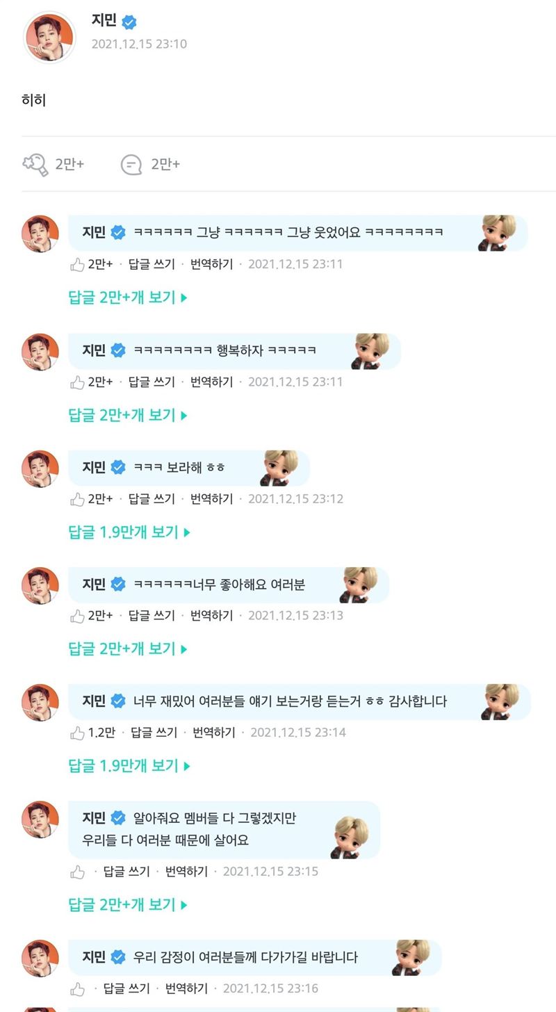 지민은 지난 15일 팬 커뮤니티 위버스에 "히히", "ㅋㅋㅋㅋ그냥 ㅋㅋㅋ 웃었어요 ㅋㅋ"라며 마치 실제 친한 친구와 대화하듯 웃음이 절로 나는 글로 팬들을 미소짓게 했다. 이어 자신의 글에 댓글로 이야기를 이어나가던 지민은 "행복하자", "보라해", "너무 좋아해요 여러분", "너무 재밌어 여러분들 얘기 보는거랑 듣는거 ㅎㅎ 감사합니다"라고 말했다.