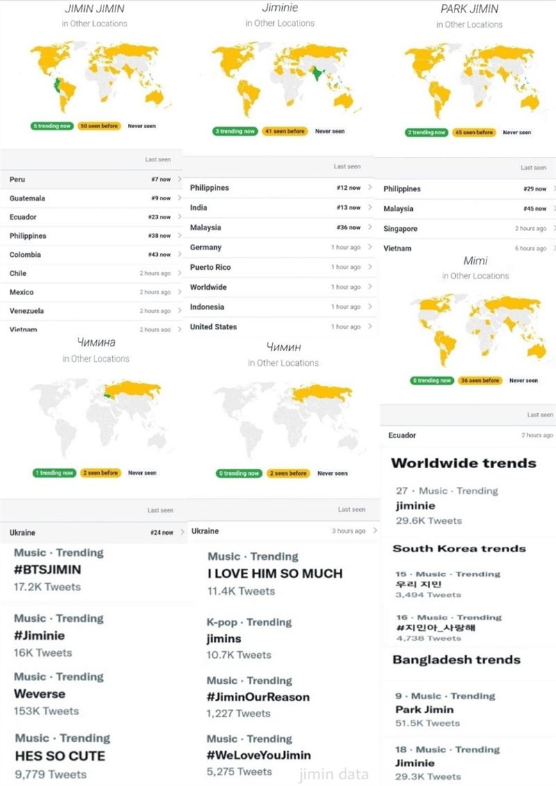 실시간트렌드 역시 뜨거웠다. '우리 지민', '지민아_사랑해', 'Jiminie', 'I LOVE HIM SO MUCH', 'WeLoveJimin', 'JiminOurReason' 등 16개 이상의 키워드로 36개 이상 트렌드를 이끌며 월드 와이드 및 한국, 미국, 독일, 인도 등 세계 곳곳 트위터를 점령했다.
